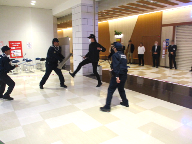 商業施設において施設関係者と協同で不審者が入館してきた場面を想定した対応訓練を実施しました。 ![]() ![]()