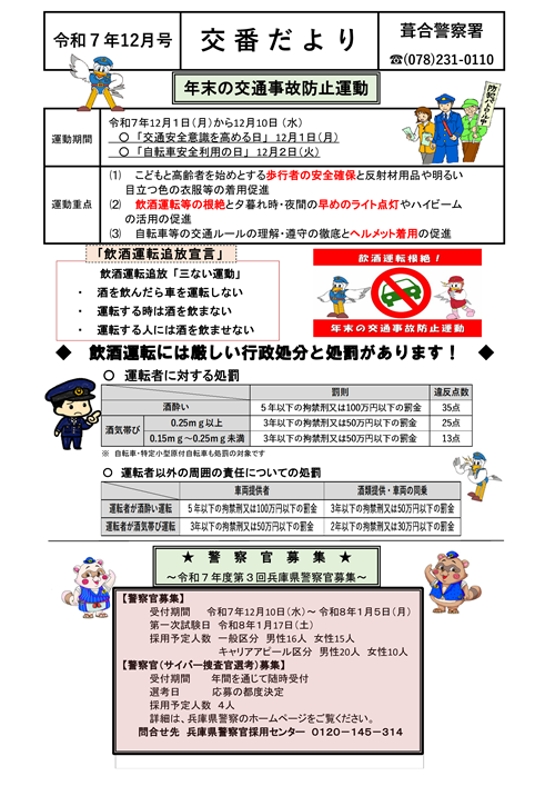 葺合署では県民、市民のために一緒に働く仲間を募集しています。 みなさんからの応募お待ちしています。 ![]() 葺っきー君 合ちゃん 葺合警察署マスコットキャラクター