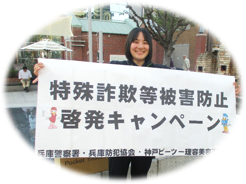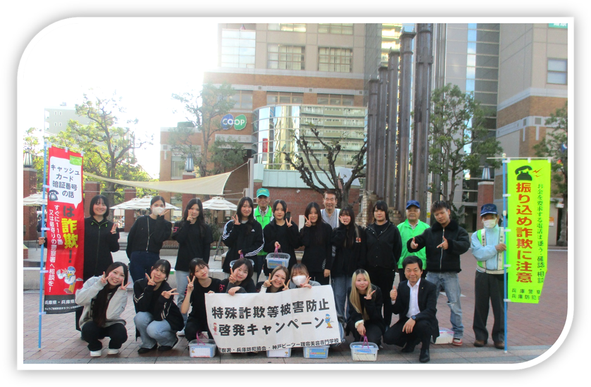 JR兵庫駅南側のキャナルタウン広場において、管内にある専門学校の学生、防犯協会とともに特殊詐欺被害防止・自転車盗被害防止の啓発キャンペーンを行いました。