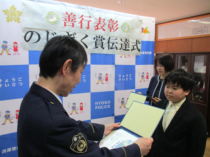 〇 違反者に実効性のある責任追及を可能とし、自転車関連事故の抑止を図るため 等が挙げられます。 兵庫警察署長 ![]() のじぎく賞伝達式の開催 令和8年3月23日、当署において、のじぎく賞の伝達式を開催しました。 ![]() ![]()