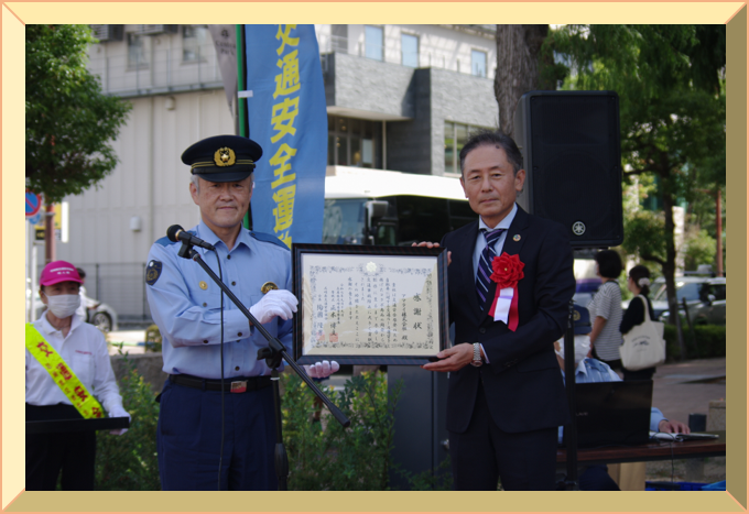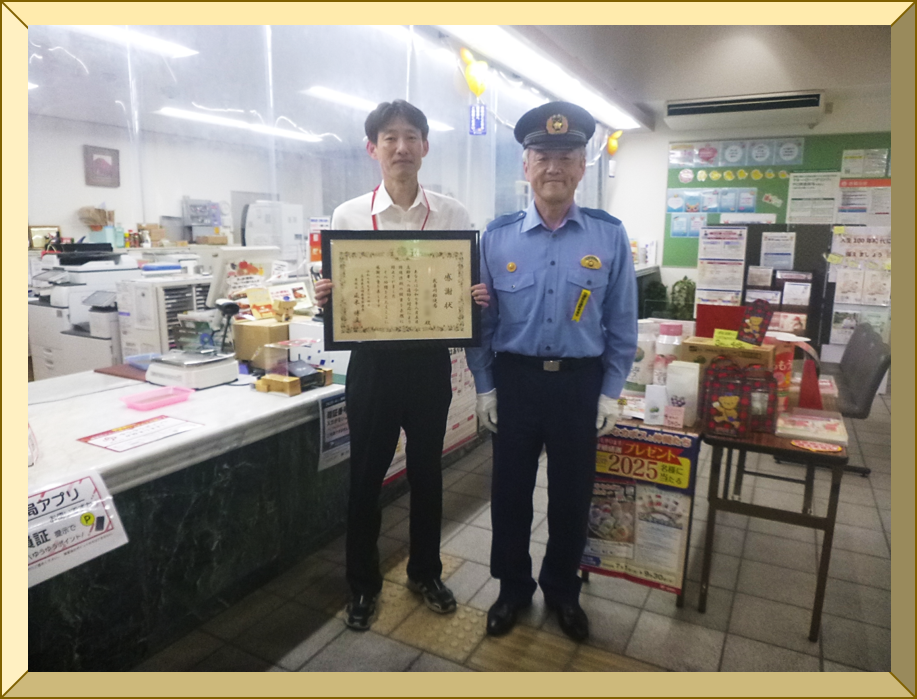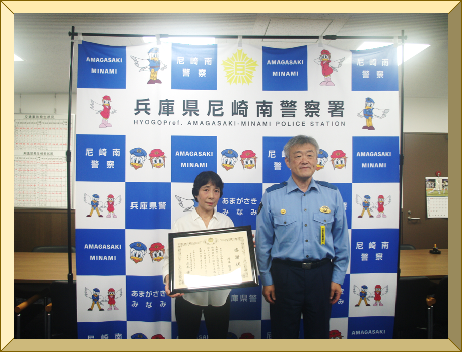 正木 博文 ![]() 署長感謝状の贈呈 特殊詐欺未然防止の功 ![]() 高齢女性が警察官を騙る犯人に誘導され、ATMから指定された口座に振り込もうとしているところを詐欺であることを看破し、振り込みを阻止して詐欺被害を未然に防止した武庫川郵便局の方に署長感謝状を贈呈しました。 被害防止にご協力いただき ![]() 署長感謝状の贈呈 特殊詐欺未然防止の功 ![]() 高齢男性が通話しながらATMを操作していたところ、コンビニでの勤務経験を生かして機を逸することなく声かけを行い、ねばり強い説得によって振り込みを思いとどまらせ、詐欺被害の未然防止に大きく貢献した塚本聡子様に署長感謝状を贈呈しました。 被害防止にご協力いただき ![]() 秋の全国交通安全運動(9月21日~9月30日)の実施に先立ち、9月19日、阪神タイガースのマスコットキャラクター「コラッキー」とこども園の園児の皆さんをお迎えして交通安全キャンペーンを開催しました。 ![]() ![]() (アマテイ株式会社のマスコットキャラクターです) コラボ啓発グッズの企画から制作までご尽力いただいたアマテイ株式会社の佐藤社長に署長感謝状を贈呈しました。 ![]() アマテイ株式会社様 ご協力ありがとうございます。 ![]() コラッキーと園児たちによる元気いっぱいのダンスに会場は大盛り上がりでした♪ ![]() ![]() ![]() 「こうつうじこがなくなりますように」浜田保育園のお友達と一緒に、色とりどりの短冊と七夕かざりに交通安全の願いを託しました。 ![]() ![]() 天まで届け ![]() ![]() 道行く人々に交通安全を呼びかけました。 ![]() 尼崎南警察署・尼崎南交通安全協会 ![]() 生活安全部長感謝状の伝達 ![]() 12年の長きにわたって少年指導委員をつとめられ、子供を対象とした犯罪抑止のため、見守り活動等少年を守る諸活動に積極的に取り組んでこられた南鬨男(ときお)さまに生活安全部長から感謝状が贈呈されました。 ![]() ![]() 署長感謝状の贈呈 尼崎市から悲惨な交通事故が無くなるように・・・との切なる願いが込められた交通安全標語「チョコチョコ まわりの安全確認」がプリントされたコラボ商品「交通安全むぎチョコ」の開発から制作まで全面的にご協力いただいた高岡食品工業さんに署長感謝状を贈呈しました。 ![]() ![]() ご協力 ありがとう ![]() 兵庫県尼崎南警察署・尼崎南交通安全協会 ![]() 庁舎見学を実施しました 4月18日、庁舎見学に来てくれた保育園児に交通安全教室と防犯教室を行いました。 ![]() ![]() ![]() ![]() ![]() ![]() ![]() ![]() ![]() 署長感謝状の贈呈 ![]() 咄嗟の行動力と迅速的確な通報で人命救助に貢献した青木ますみさまと藤原祐弥さまに署長感謝状を贈呈しました。 ![]() ![]() 感謝状贈呈式の模様 ![]() 迅速的確な対応に ![]() |
