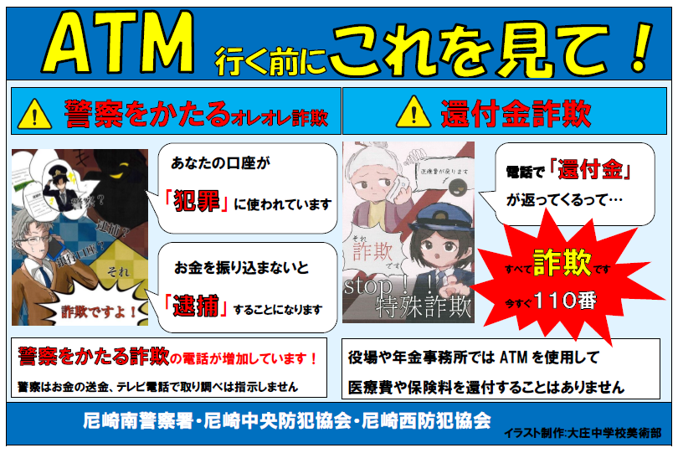 署長感謝状の贈呈 特殊詐欺被害を防止するため、尼崎市立大庄中学校美術部の皆さんのご協力を得てドアピタチラシを制作しました。 ![]() ドアピタチラシは、警察官が高齢者宅などを訪問した際、玄関ドアの内側に啓発チラシをピタっと貼らせていただくもので、詐欺の電話を受けて外出しようとするその時に、ドアに貼られたこのチラシが「ちょっと待って!それ詐欺ですよ!」と注意喚起して詐欺被害を未然に防ぐことを目的としています。 ![]()
