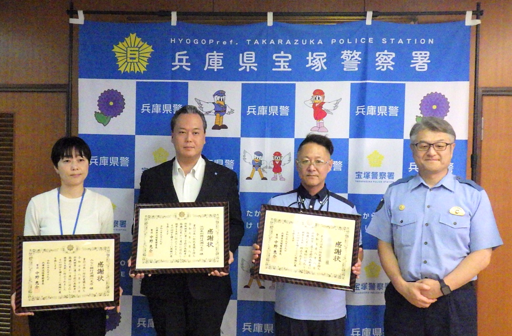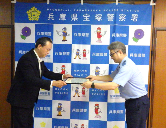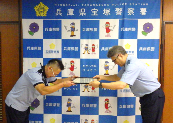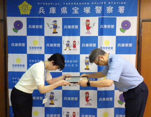 令和7年9月19日に、宝塚警察署において、特殊詐欺の被害防止に貢献いただいた、管内の金融機関職員・コンビニエンスストア店員の方々に署長感謝状を贈呈しました。