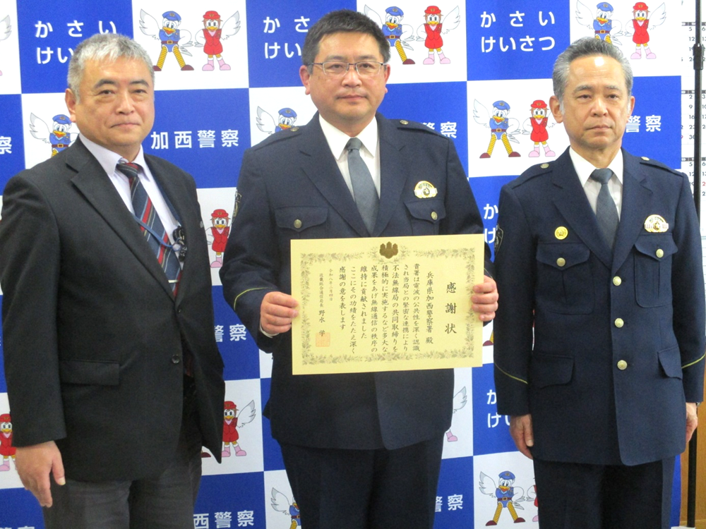 昨年11月に近畿総合通信局と不法無線局の合同取締りを行い被疑者検挙の功績により2月4日に同通信局から感謝状を受賞しました。