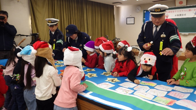 「交通安全 クリスマスに願いを」 管内のこども園に協力いただき、サンタクロースやトナカイがそりを引くイラストに「交通安全を願うメッセージ」を貼り付けた交通安全横断幕を作成しました。