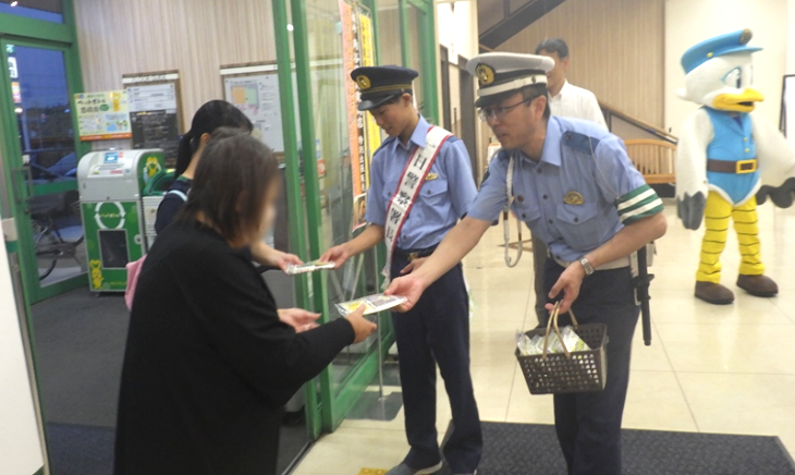 豊岡署でパトロールの出発式を行い、商業施設で、交通安全の啓発グッズの反射材等を配布しました。
