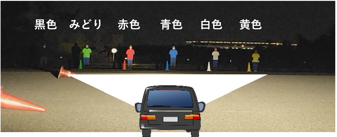 服装の色別に見えるまでの距離を比べて見ると・・・ 反射材を着用すると、発見されやすいよ‼ 黒っぽい服装 明るい服装 反射材着用