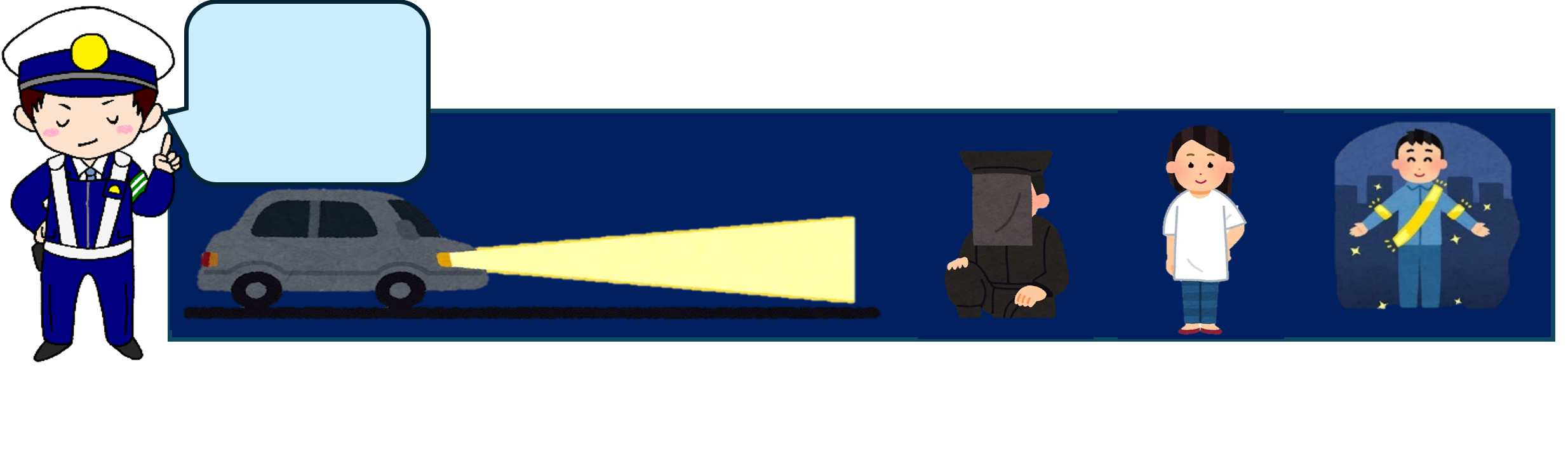 夜間に外出する時は、反射材を着用したり白や黄色などの明るい服装に心がけましょう。