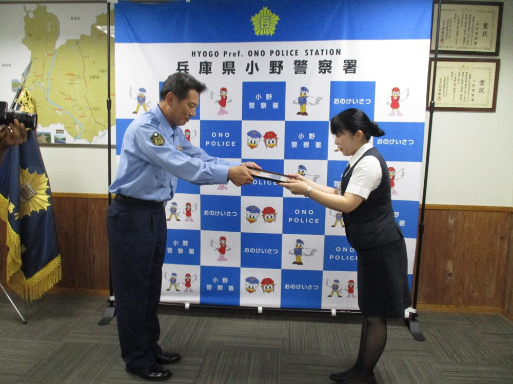 特殊詐欺被害を未然に防止された、みなと銀行小野支店の職員に対し、署長感謝状を贈呈しました。 平素から特殊詐欺被害防止への意識を高く持ち、警察活動に協力いただいていることに、深く感謝いたします。